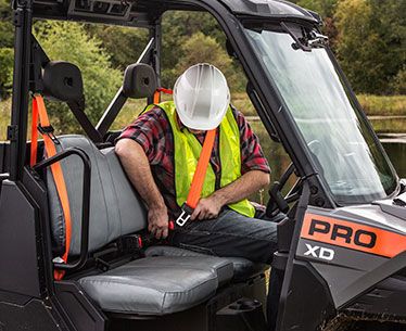 Safety is number one for government and commercial users, and the PRO XD is engineered from the inside out for jobsite safety, including orange seatbelts and decals for high visibility, standard backup alarm and horn, and speed-limited for jobsite compliance.